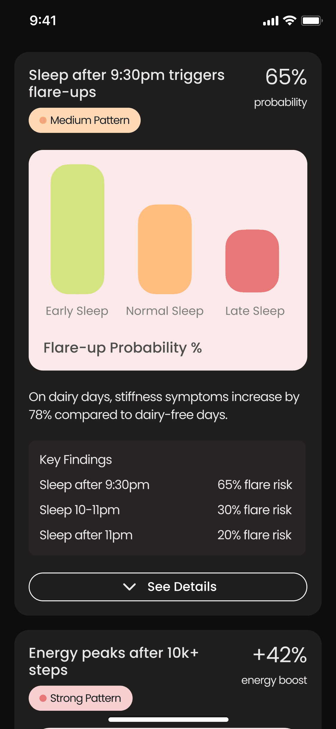 Trigger Cards show what factors are connected to your flares and symptoms, with confidence levels with plain-language reasoning.